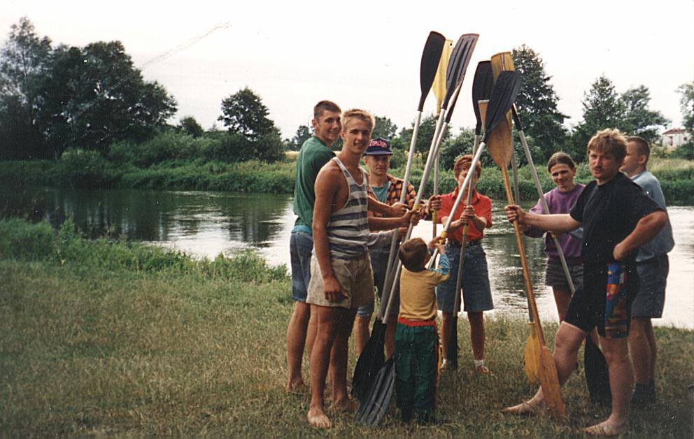 Każdy kajakarz trzyma wiosło skierowane piórem do środka komandora spływu.